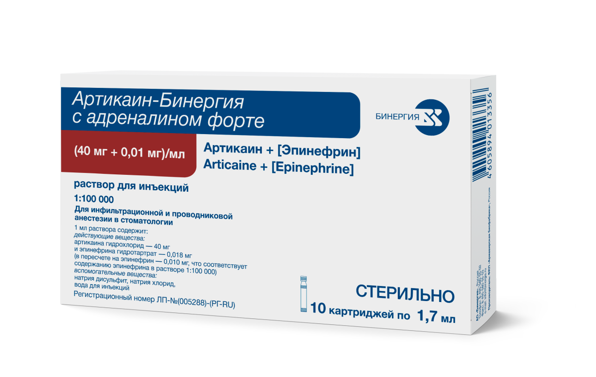 Артикаин Бинергия 1:100 000 Форте - стоматологический анестетик российского производства в карпулах, раствор для инъекций с содержанием эпинефрина 0,01 мг на 40 мг. Увеличенная доля эпинефрина не только продлевает действие препарата, но и снижает риск возникновения кровотечения в области хирургического вмешательства.
