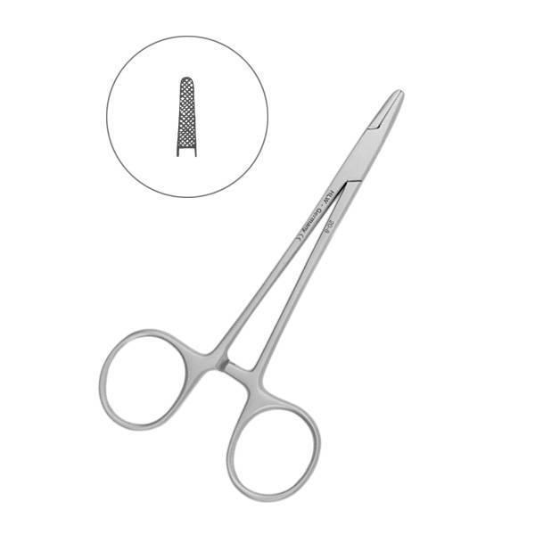 Прямая рабочая часть инструмента на внутренних поверхностях имеет крестообразные насечки, благодаря которым иглодержатель плотно фиксируется на плоскости хирургической иглы и обеспечивает точность проведения иглы на всех стадиях наложения швов.