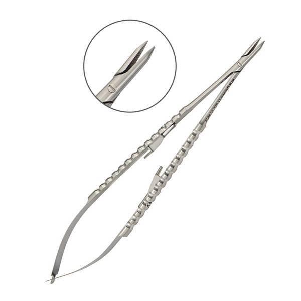 Наружные поверхности ручек инструмента покрыты поперечными бороздками, предотвращающими скольжение фаланг пальцев в перчатке. С внутренней стороны рукояток иглодержателя установлен нажимной одноступенчатый фиксатор. К каждой ручке прикреплена наружная пластиночная разводная пружина, обеспечивающая плавный ход инструмента.