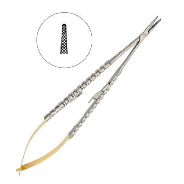 Рабочие поверхности инструмента имеют вставки из твердого сплава карбид-вольфрама, которые обеспечивают повышенную устойчивость к истиранию. Благодаря крестообразным насечкам на внутренних поверхностях щечек иглодержатель надежно фиксируется и не скользит по плоскости хирургической иглы при наложении шва.