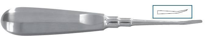 Небольшой изгиб между соединительным стержнем и рабочей частью позволяет без затруднений ввести люксатор между корнем зуба и костной тканью лунки и легко и быстро осуществить самые сложные удаления. Острая, очень тонкая, овальной формы щечка инструмента без затруднений проникает и разрезает периодонтальную связку с минимальной травмой окружающих мягких тканей.