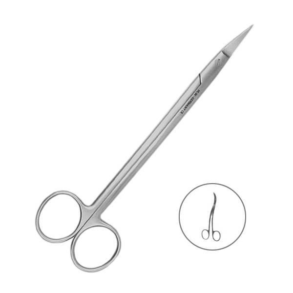 Инструмент имеет двойной изгиб по плоскости, который облегчает введение ножниц в глубоко и труднодоступные участки полости рта.