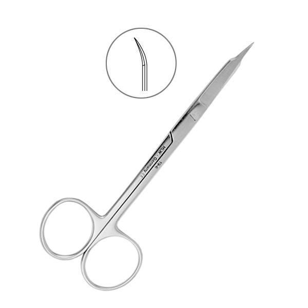 Рабочая часть ножниц изогнута по плоскости, что способствует введению инструмента в глубокорасположенные участки полости рта. Одно из самозатачивающихся лезвий имеет зубчатую режущую поверхность, предотвращающую скольжение инструмента по поверхности мягких тканей. Симметричные заостренные рабочие части ножниц истончаются к вершине. Такая конструкция лезвий облегчает проведение операции по коррекции мягких тканей в полости рта.