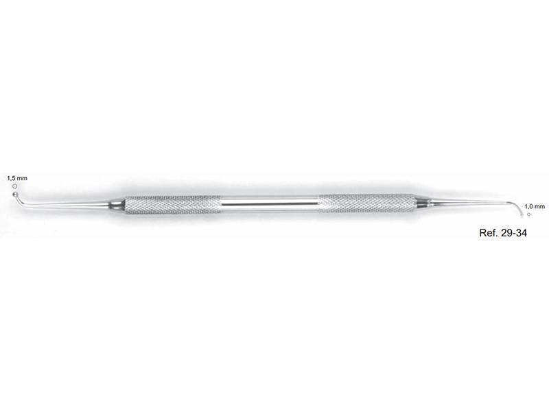Двусторонний штопфер представляет собой держатель в виде стержня, на обоих концах которого расположены рабочие части, каждая из которых имеет шаровидную форму. Диаметры рабочих частей стоматологического штопфера 1,5 и 1 мм соответственно. Такое строение инструмента прекрасно подходит для пломбирования жевательных зубов при помощи конденсируемых композитов.
