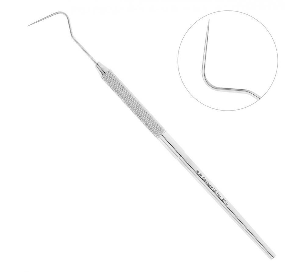 Рабочая часть одностороннего инструмента имеет серповидную форму с заостренным и удлиненным окончанием, что позволяет вводить стоматологический зонд глубоко в кариозную полость и десневой карман, не травмируя мягкие ткани.