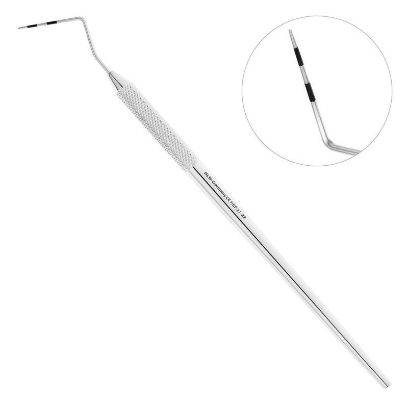 Рабочая часть периодонтального инструмента имеет изгиб по плоскости и закругленный конец. Внешняя поверхность рабочей части зонда имеет цветовые маркировки 3, 6, 9 и 12 мм, благодаря которым можно легко обнаружить и определить глубину периодонтальных карманов. Тонкая рабочая часть инструмента позволяет проникать в плотные фиброзные карманы.