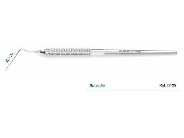 При помощи данного зонда в зубной канал вертикально вводится гуттаперчевый штифт в сторону апикального отверстия. Для придания штифту эластичности, конец заостренного спредера необходимо предварительно разогреть и прижать им штифт к стенке зуба. Далее пломбировочный материал утрамбовывается инструментом в боковом направлении посредством вращательных движений.