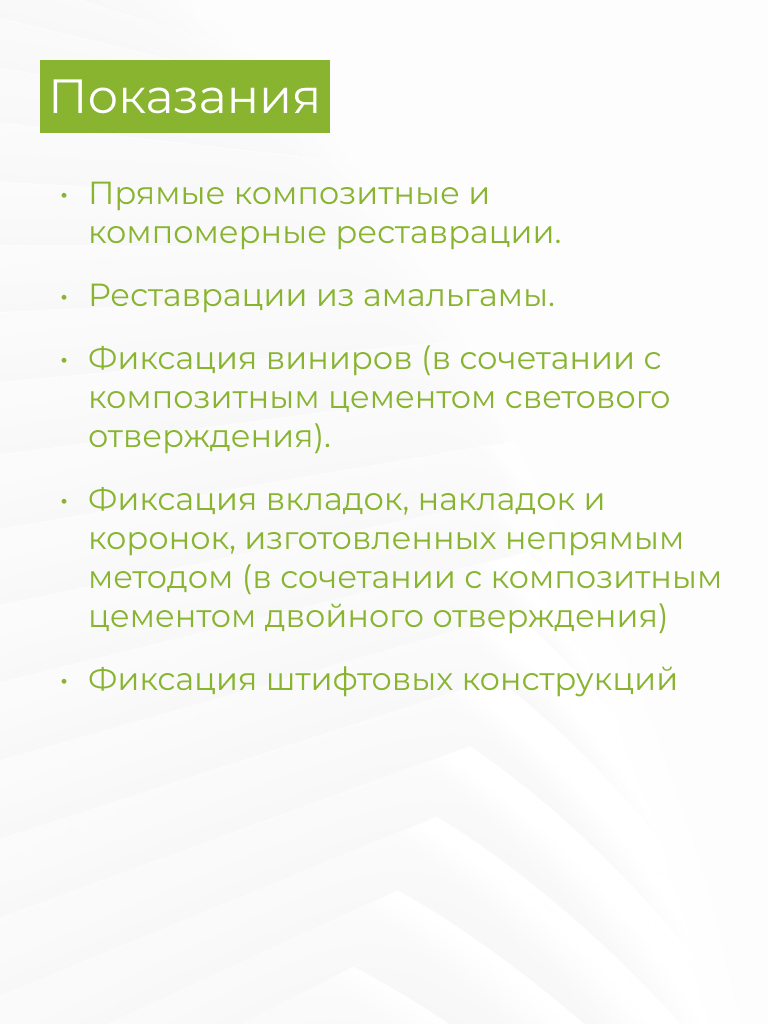 - Бондинг композитных светоотверждаемых реставрационных материалов к эмали и дентину.
