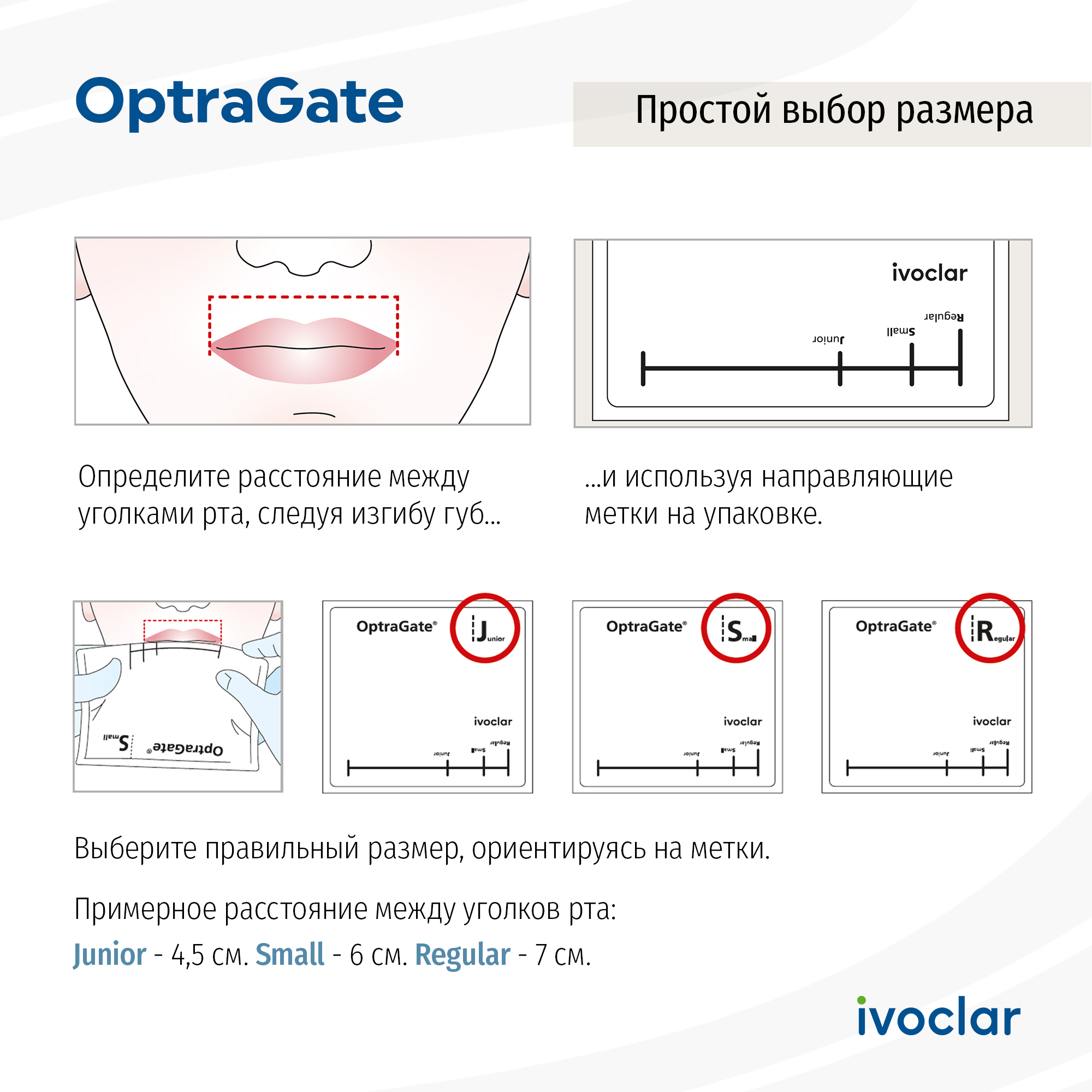 Внимание! Для более корректного определения расстояния применяйте определительную шкалу с соответствующими отметками (напечатаны на упаковке). При измерении производитель рекомендует следовать слегка изогнутой линии губ, а не использовать жесткие средства определения расстояния до уголков рта. Если при определении размера у вас возникли сомнения, для обеспечения лучшей посадки применяйте больший размер.
