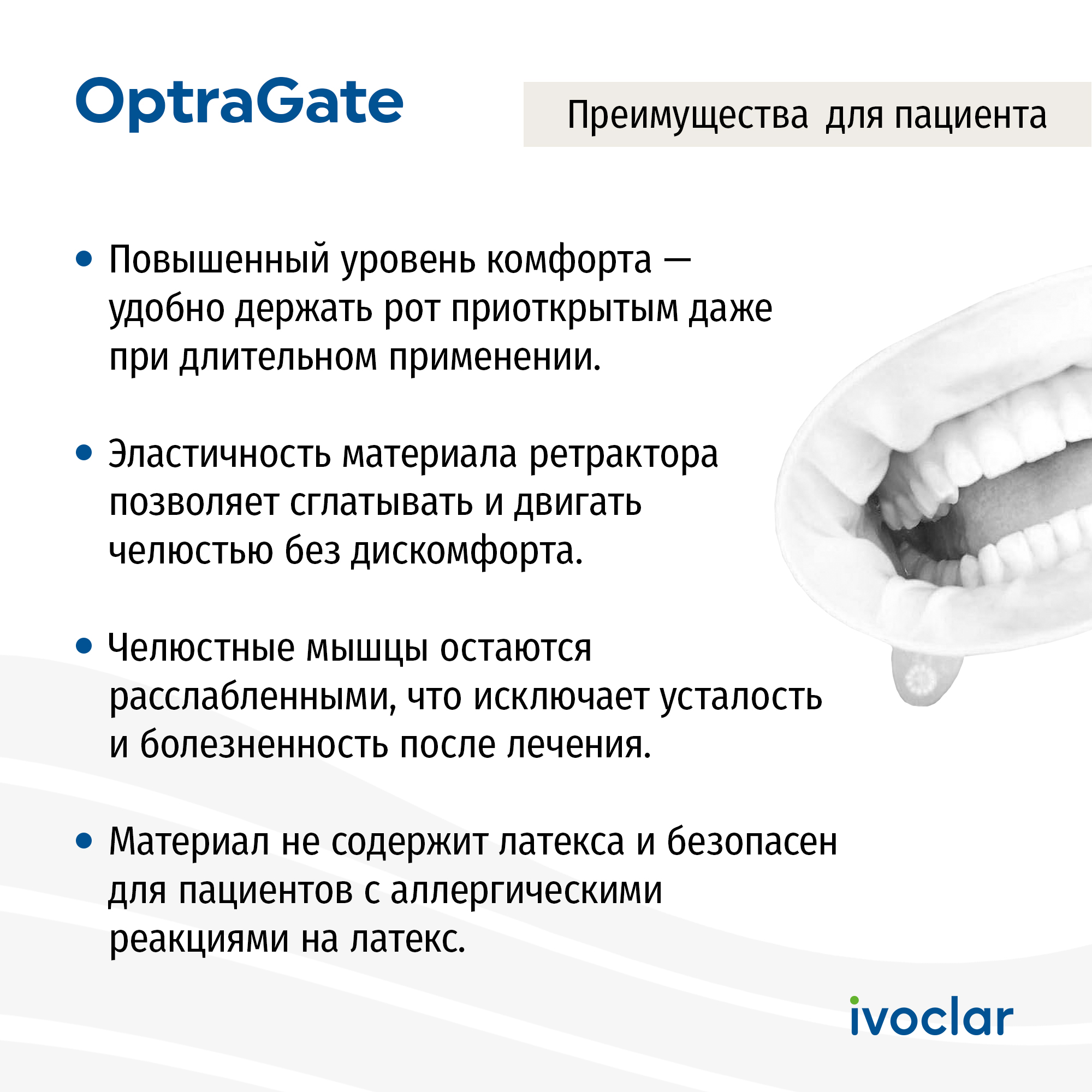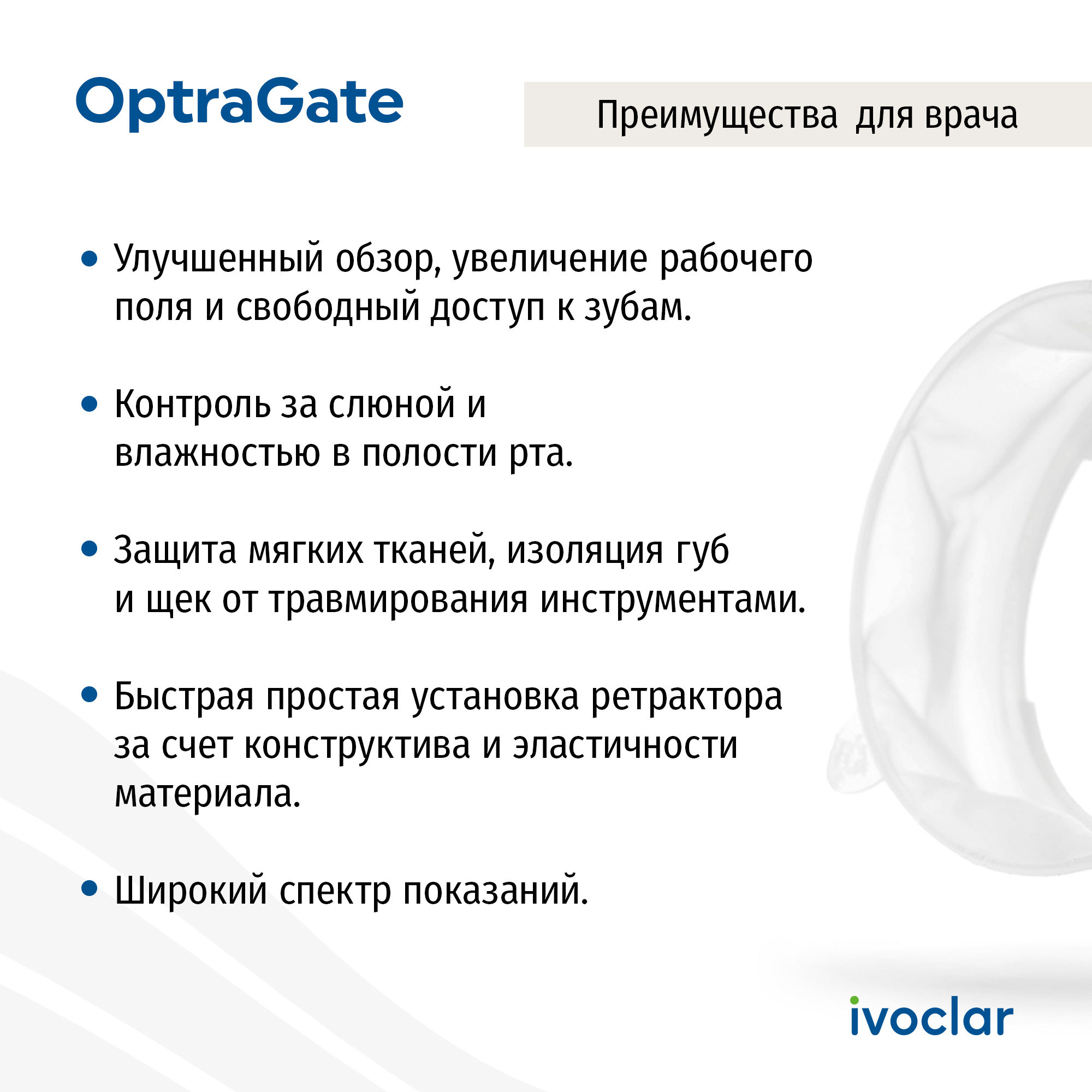 OptraGate® предназначен для изоляции губ и щек пациента на время проведения стоматологических манипуляций. В отличие от традиционных жестких конструкций роторасширителей он не травмирует слизистую и максимально прост в установке: вводится в ротовую полость пациента легким движением одной руки, моментально изолируя слизистую губ и щек.