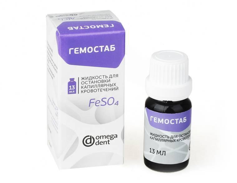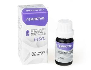 Описание: "ГЕМОСТАБ" представляет собой водный раствор сульфата железа. Сульфат железа останавливает любое капиллярное кровотечение. В случае, когда нужно устранить кровотечение из десны, следует изолировать обрабатываемый участок ватным тампоном и обработать гемостатическим раствором поверхность десны в области кровотечения и вокруг нее, во избежание просачивания крови. После удаления пульпы или ее распада часто возникает кровотечение из корневого канала. Образование гематомы у верхушки корня зуба влечет за собой образование воспалительного очага с последующим развитием гранулемы. С целью ликвидации подобных последствий следует обработать корневой канал турундой, смоченной в растворе гемостатической жидкости.