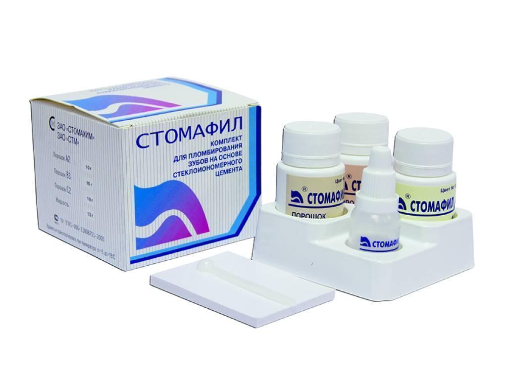 Состав: "Стомафил" относится к классу стеклянных иономерных цементов и состоит из порошка - тонкодисперсного алюмофторсиликатного стекла и жидкости затворения - водного раствора поли-акриловой кислоты. Обладает химической адгезией к дентину и эмали. Обеспечивает противокариесный эффект за счет пролонгированного высвобождения фтора.