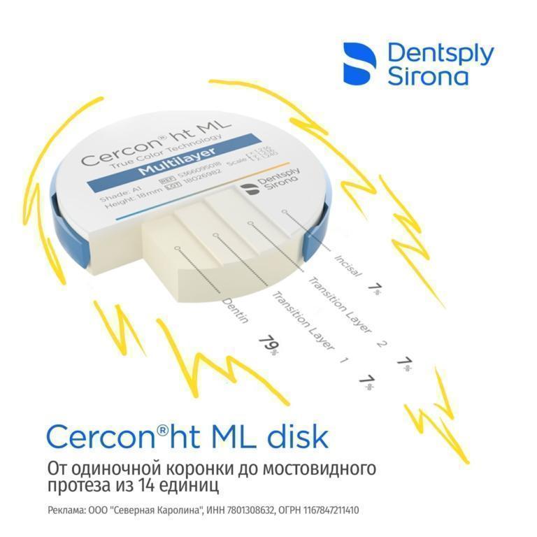 Уникальный и неподражаемый. Встречайте новинку от Dentsply Sirona — комбинированный многослойный диск из диоксида циркония Cercon®ht ML disk. Материал сочетает в себе высокую прочность и натуральную эстетику. Основное преимущество — от одиночной коронки до мостовидного протеза из 14 единиц. Без ограничений по размещению в диске даже протяженных мостовидных протезов.