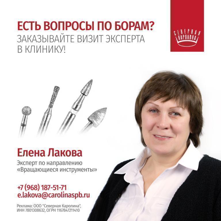 Меня зовут Елена Лакова и вот уже 13 лет я предоставляю клиентам информацию о борах. Моя задача — помочь. Не секрет, что время стоматологов и специалистов, занимающихся в клинике закупками, расписано по минутам. Моя квалификация позволяет существенно сэкономить ваше время, показать товар лицом (я приезжаю в клинику с демонстрационными папками), предложить лучшее с учетом ваших потребностей и ответить на порой не самые простые вопросы. Выезд эксперта в клинику¹ — услуга бесплатная. Просто отправьте заявку на мой электронный адрес, и я с радостью согласую удобное для вас время визита: e.lakova@carolinaspb.ru или звоните мне по телефону: +7 (968) 187-51-71